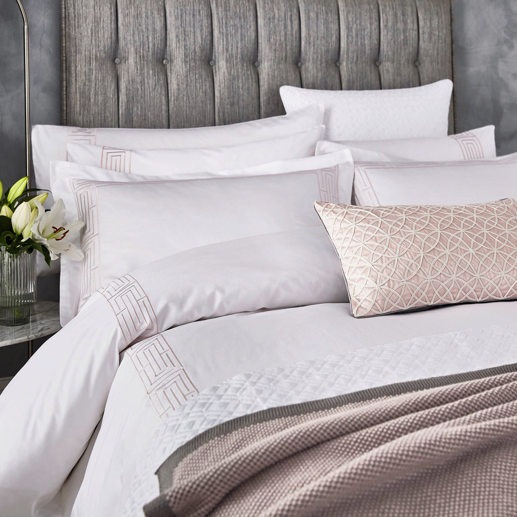 Tropea combines the luxury of a wonderfully soft sateen weave with a keen attention to detail, to create a range of sumptuous bedlinen with a discreet glamour. White 300 thread count cotton sateen is embellished with a signature geometric pattern in a dusky pink colourway. This timeless design will ensure your room always stays in style.The range includes duvet covers, standard, large standard and oxford pillowcases.
