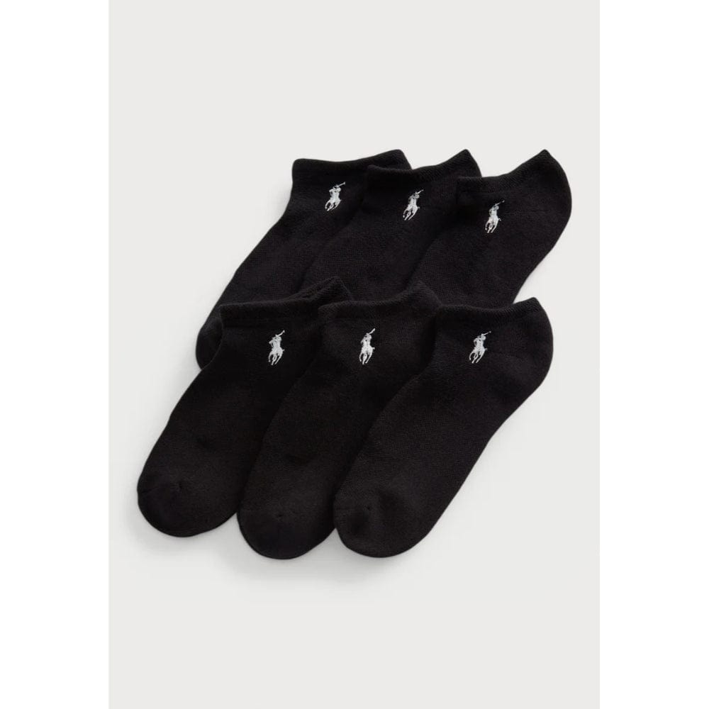Polo Ralph Lauren’s 6-pack low cut ankle trainer socks feature a comfortable knit blend of cotton, nylon, polyester, and elastane. They offer a snug fit and breathability, ideal for active wear. Machine washable at 30 °C, these black socks are durable and easy to care for, perfect for everyday training.