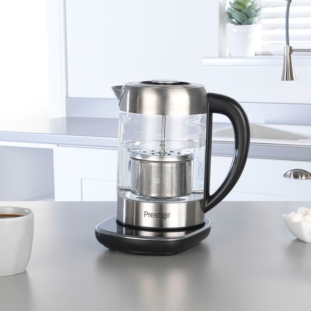 Perfect for a new home or creating a fresh look in your kitchen, this Prestige Glass Kettle has a sleek transparent exterior which will look great in any décor. Made from glass, the kettle features a 360 degree swivel base making it suitable for both left and right handed users and a separate tea infuser basket. With a rapid boil, this kettle is ideal for any family home.