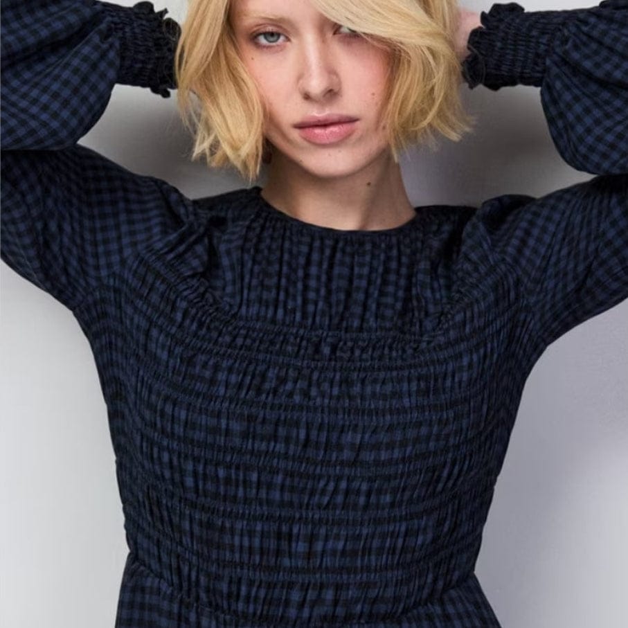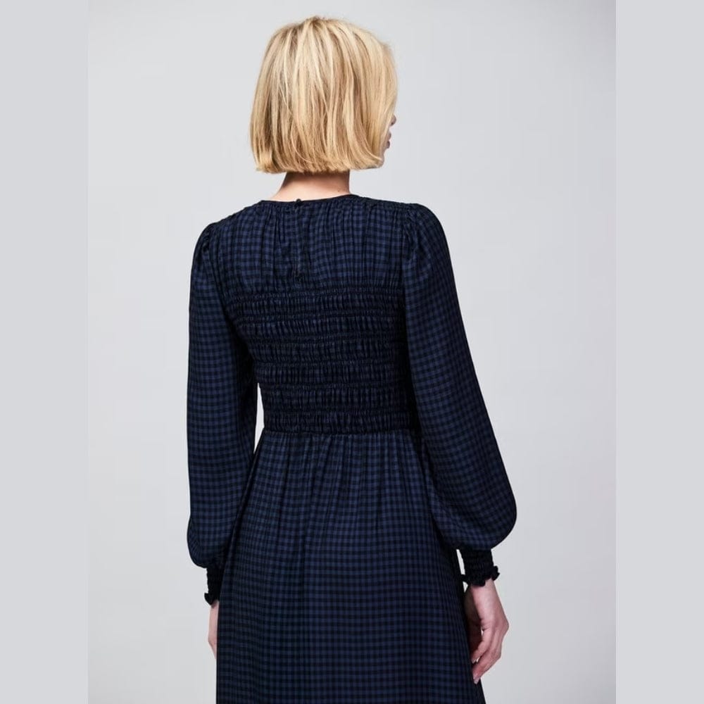 Elevate your seasonal wardrobe with this navy checked dress, expertly tailored for petite frames under 5'3". The shirred bodice creates a refined silhouette, while full-length sleeves with gathered cuff openings offer understated elegance. Midi length and unlined construction provide effortless movement, perfect for layering through winter and spring. A discreet back neck button fastening completes the polished design. Style with knee-high boots and a vintage-inspired coat for timeless sophistication.