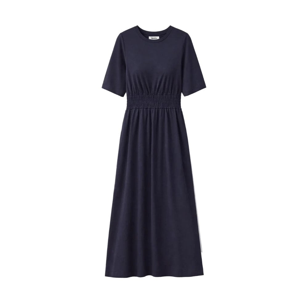 Crafted from navy stretch-cotton with a shirred waist, this really is the perfect day dress. We love the simple, short-sleeve silhouette and flattering midi length, which is best complemented by flats and an oversized bag. Midi length hem Short sleeve length Shirred waist detail.