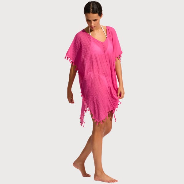 Add a pop of color to your beach look with the Seafolly Amnesia Kaftan in vibrant Hot Pink. This fashionable kaftan features a mini length, V neck, and tasselled hems, all made from soft and comfortable cotton gauze. Perfect for throwing over your Seafolly swimwear for a stylish cover-up.