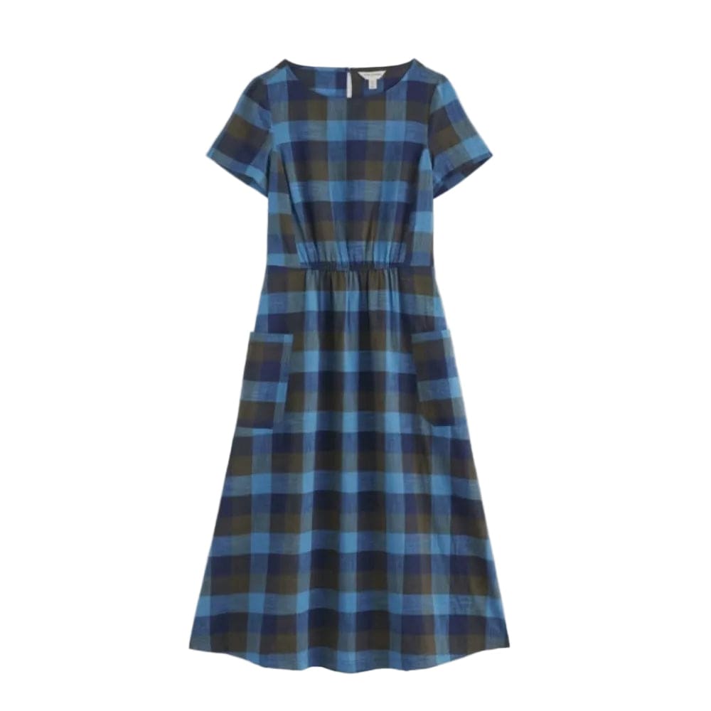 An organic cotton waisted dress with elegant details. It has a curved boat neckline and seamless short sleeves, complete with a keyhole cut out at the back of the neck for another stylish touch. For added shape, it has gentle gathers and bust seams, complete with front pockets.