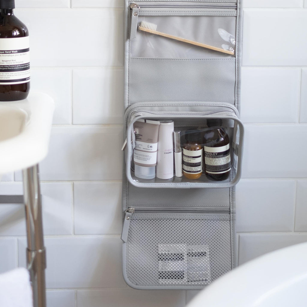 This wash bag easily folds into a compact bag, perfect for travelling, and is finished with a hanging hook for easy access.
