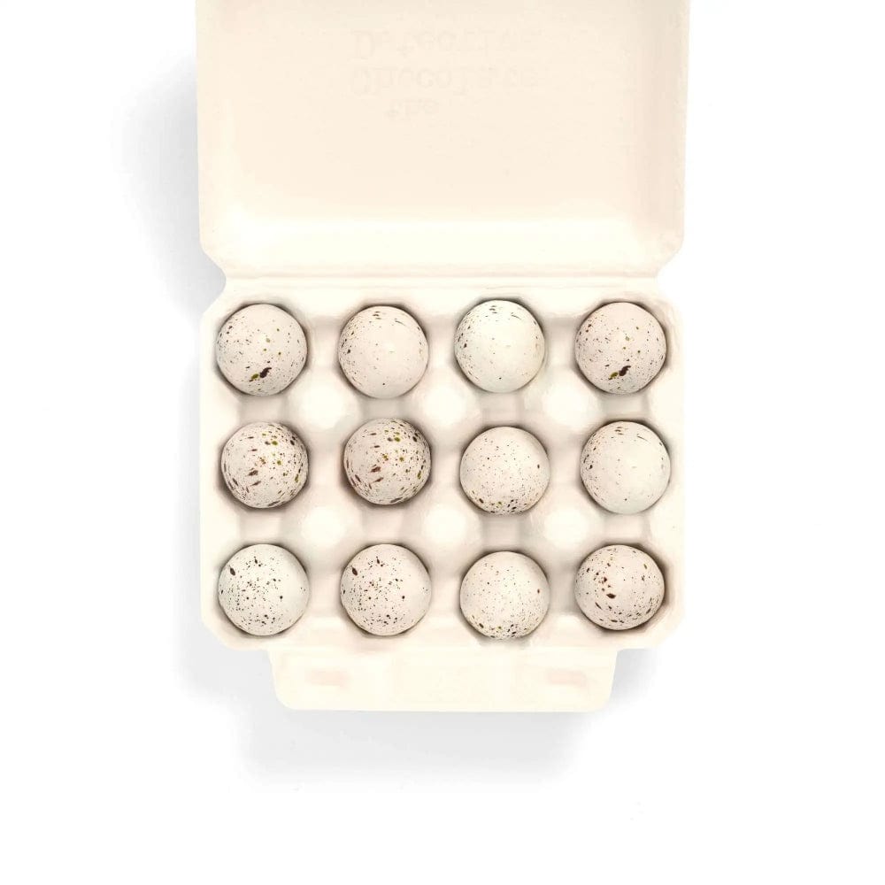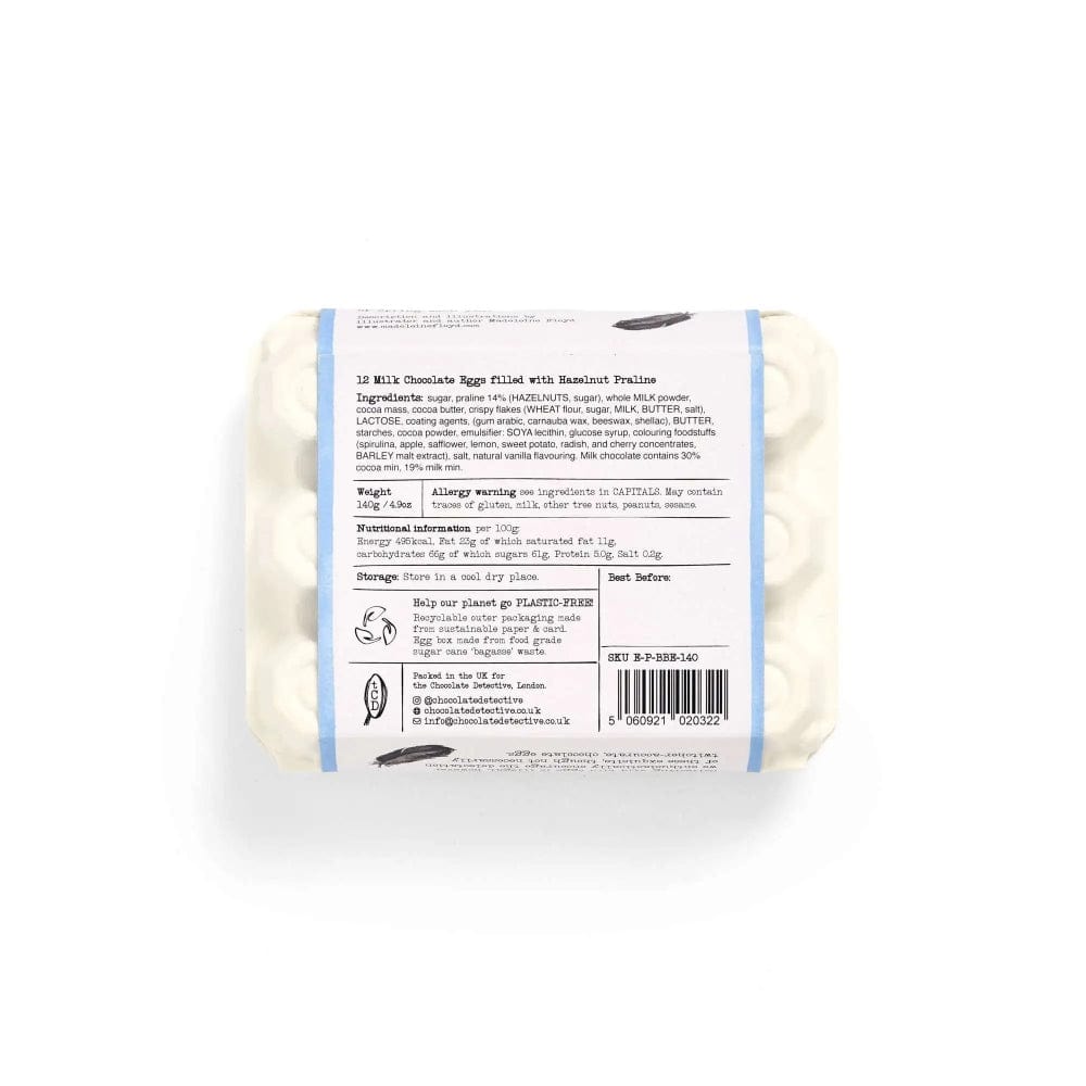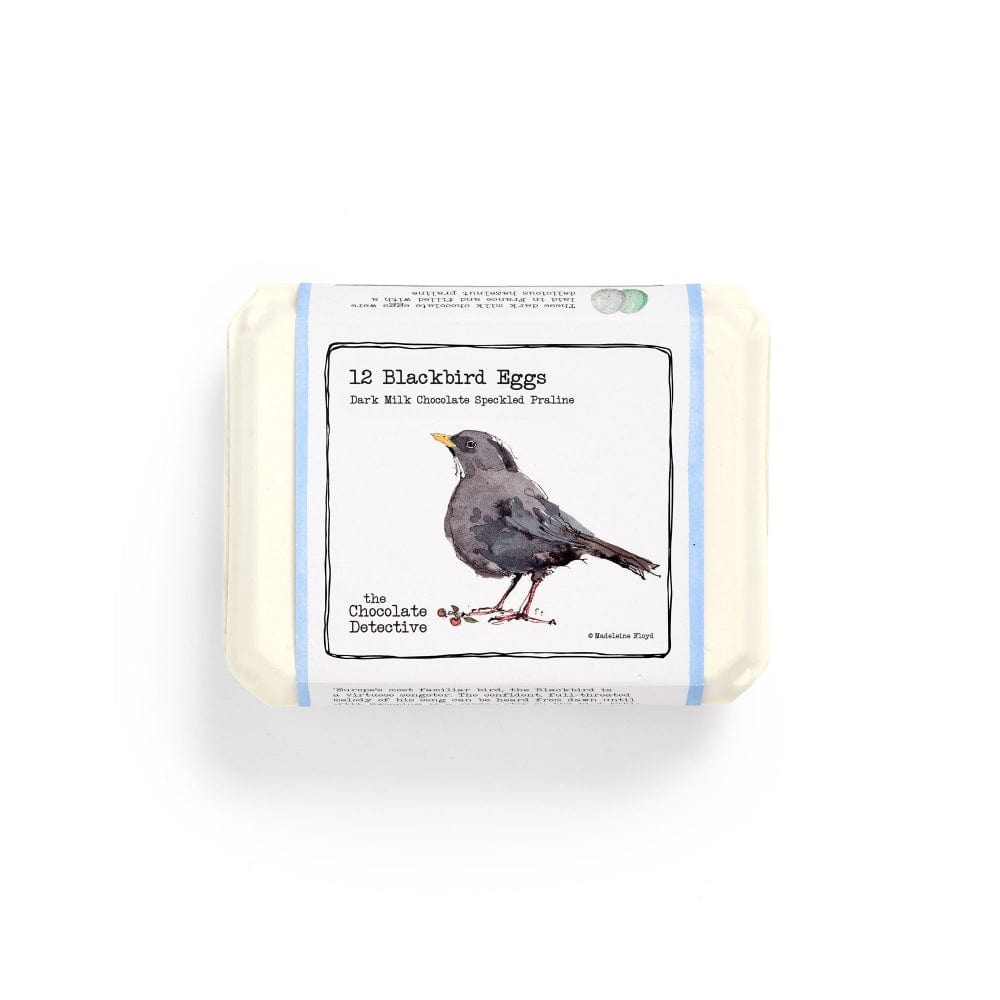 12 Chocolate Eggs filled with a fine hazelnut praline. A layer of milk and dark chocolate is filled with the praline and then wrapped in a fine sugar shell and life-like speckles. Please note that this summer the Blackbird is laying white eggs!