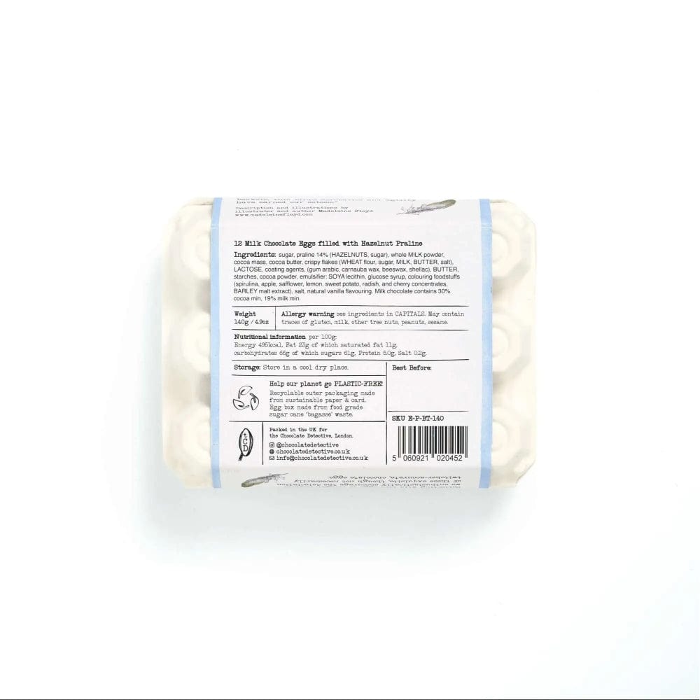 12 Chocolate Eggs, 6 filled with a fine hazelnut praline and 6 with a subtle salted caramel. At present the Blue Tit is laying white and brown eggs!