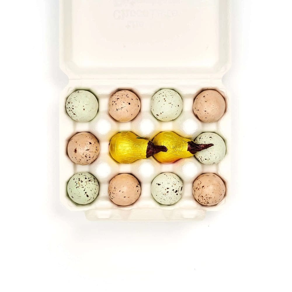 10 chocolate eggs with 2 liqueur pears! You may ask how there comes to be a partridge in a pear tree in the Christmas song? One explanation is that the French for partridge is ‘perdrix’ (pronounced ‘pear-dree’) so we are really singing ‘partridge in a partridge’. But that doesn’t quite work so well…in any case this is certainly one of our best selling Christmas lines