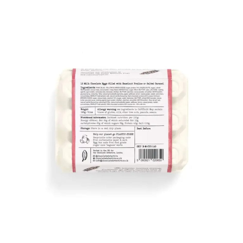 12 chocolate eggs, 6 filled with a fine hazelnut praline and 6 with a subtle salted caramel. A layer of milk and dark chocolate is filled with caramel or praline and then wrapped in a fine sugar shell and life-like speckles. Please note that this summer the Cuckoo is laying white and brown eggs!