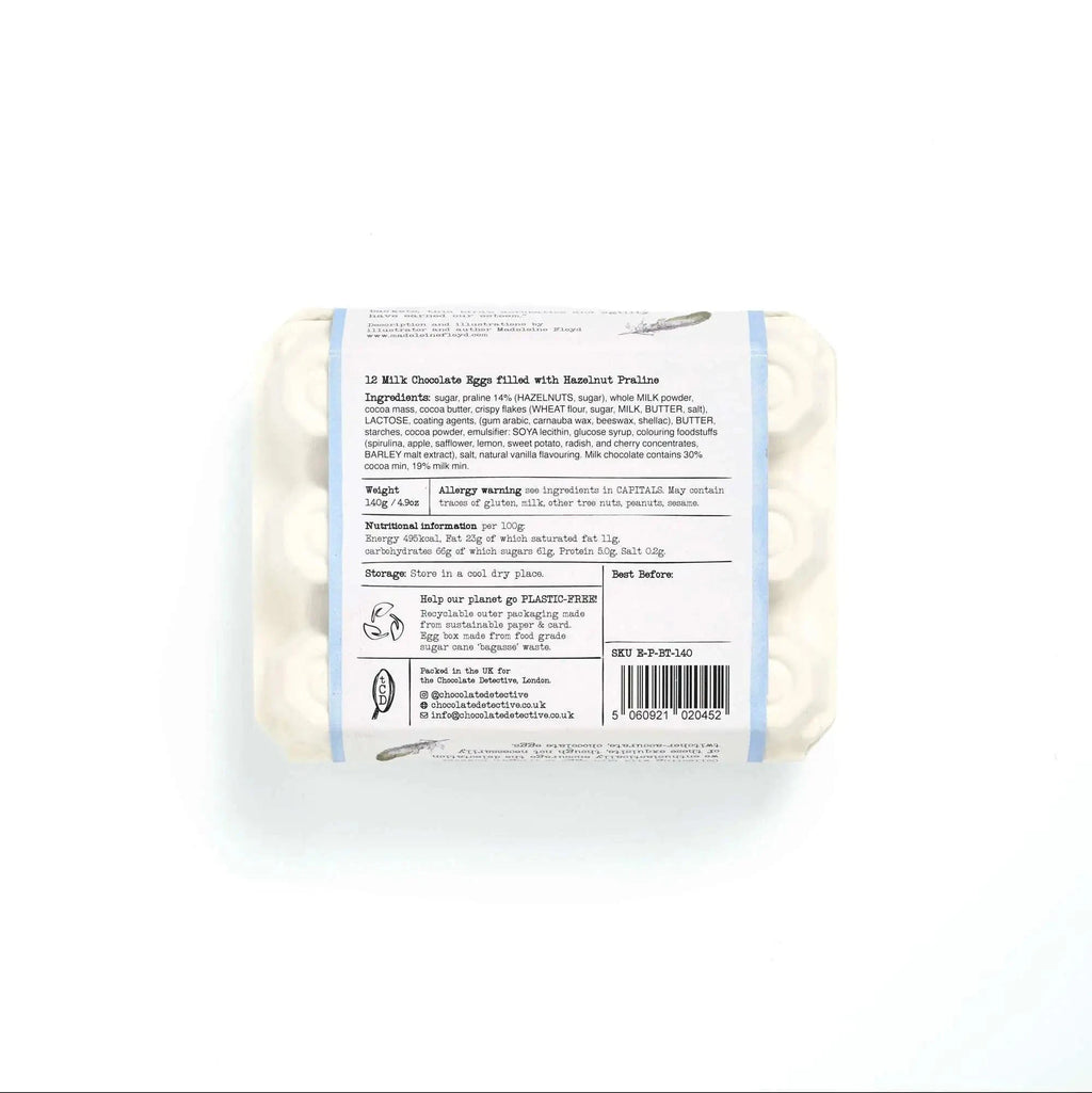 12 Chocolate Eggs filled with a fine hazelnut praline. Layers of dark and milk chocolate are then filled with the praline before being wrapped in a fine sugar shell and life-like speckles.