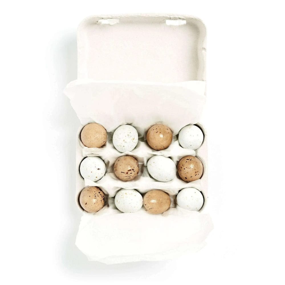 12 Chocolate Eggs, 6 filled with a fine hazelnut praline and 6 with a subtle salted caramel. A layer of dark and a layer of milk chocolate is filled and then given a thin sugar shell with speckles. The Legbar are currently laying white and brown eggs!