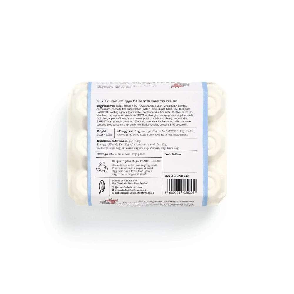 12 Chocolate Eggs, 6 filled with a fine hazelnut praline and 6 with a subtle salted caramel. At present our robins are laying white and brown eggs!