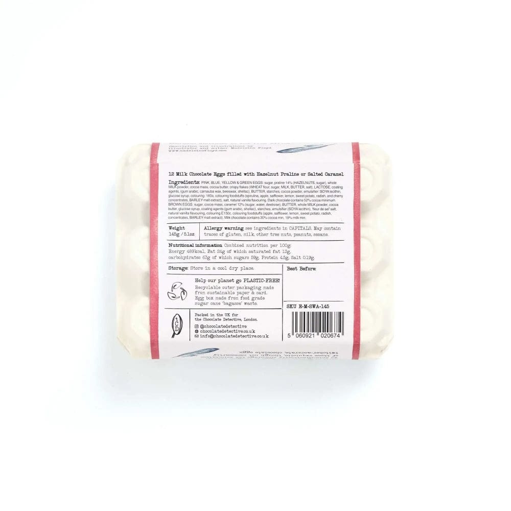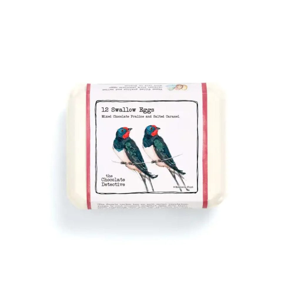 12 Chocolate Eggs, 6 filled with a fine hazelnut praline and 6 with a subtle salted caramel. A layer of milk and dark chocolate is filled with caramel or praline and then wrapped in a fine sugar shell and life-like speckles. Please note that this summer the Swallow is laying white and brown eggs!