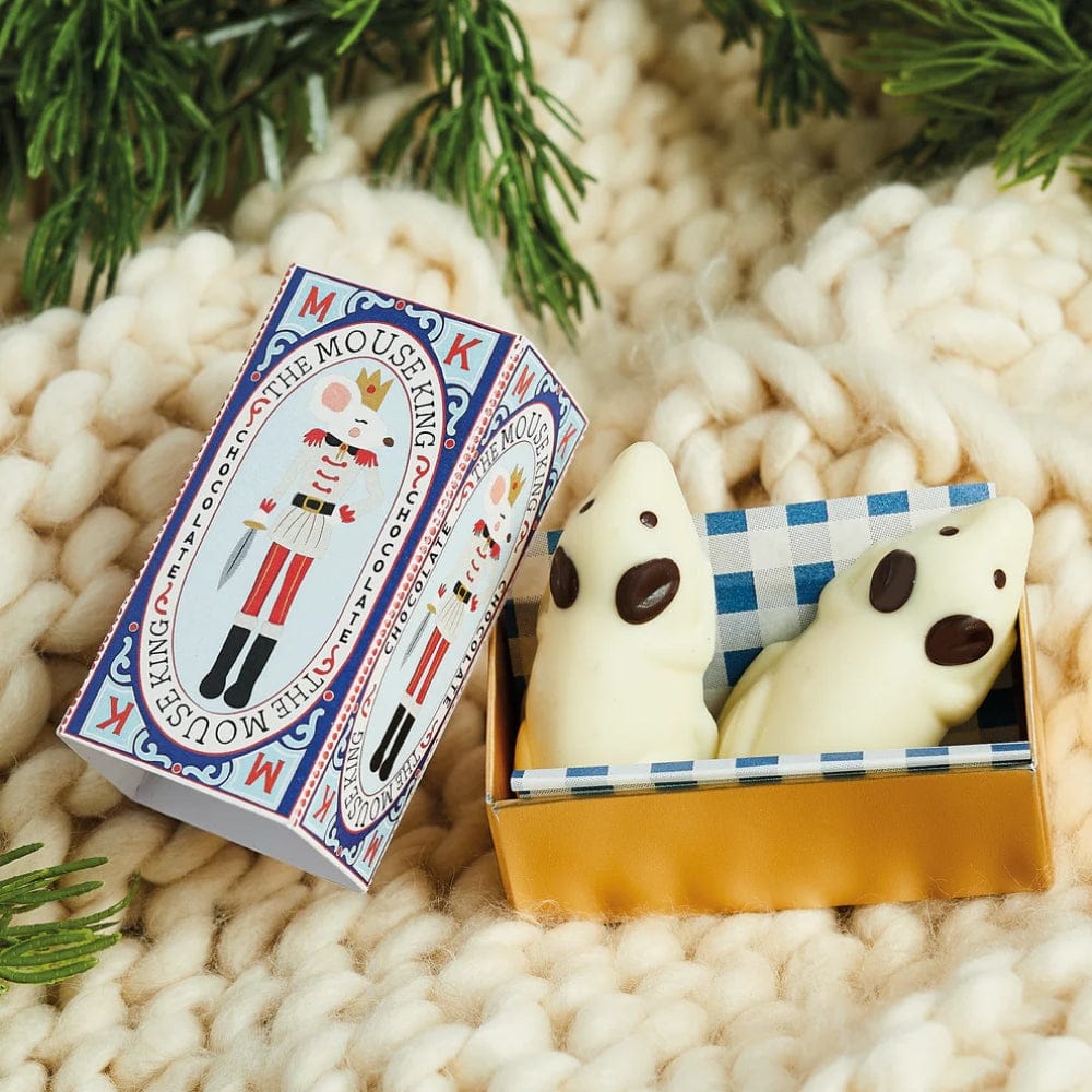 The Mouse King! Inspired by the famous Nutcracker. Two white chocolate mice are presented in our beautifully illustrated little matchbox.