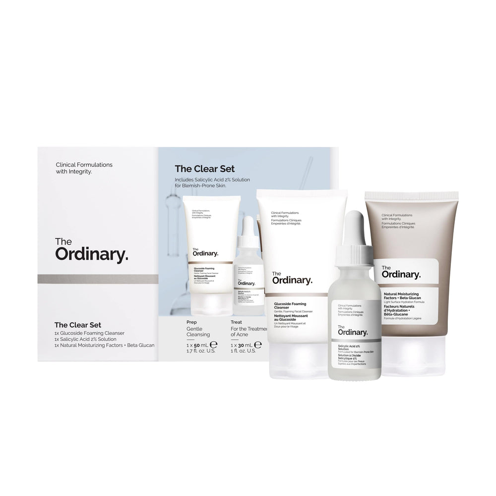 The Clear Set offers a targeted regimen, with Salicylic Acid 2% Solution formulated for blemish-prone skin.