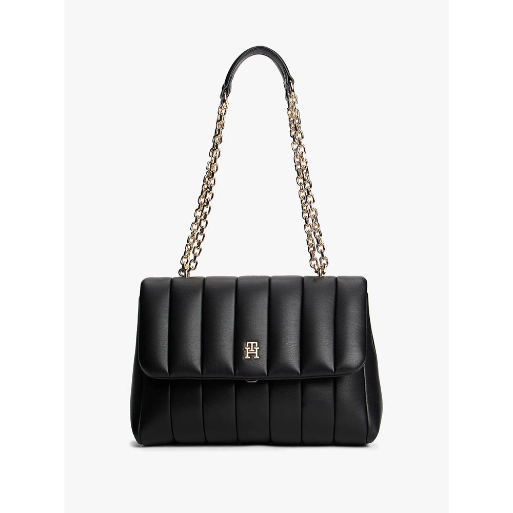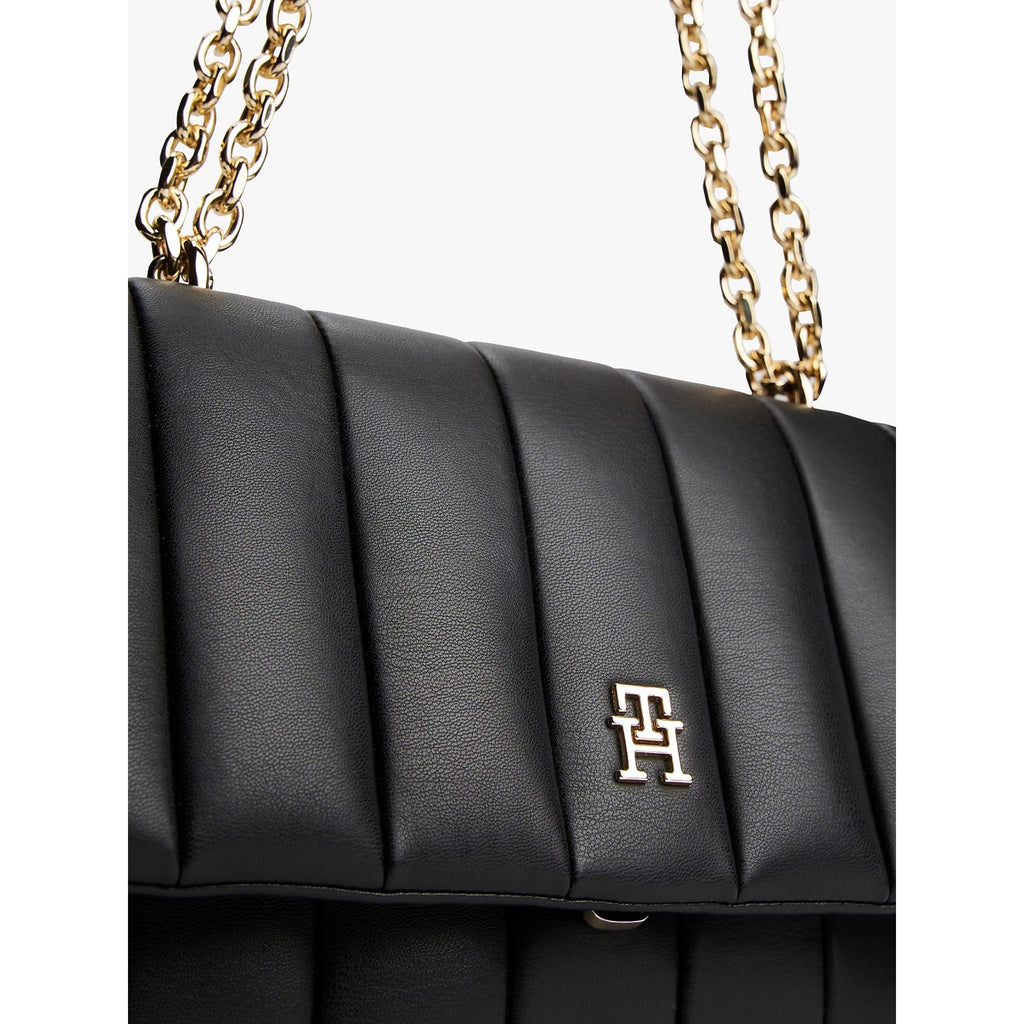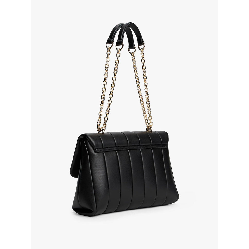 This bag features a padded design for a sense of modern glamour, while the adjustable double chain crossbody strap enhances its versatility.