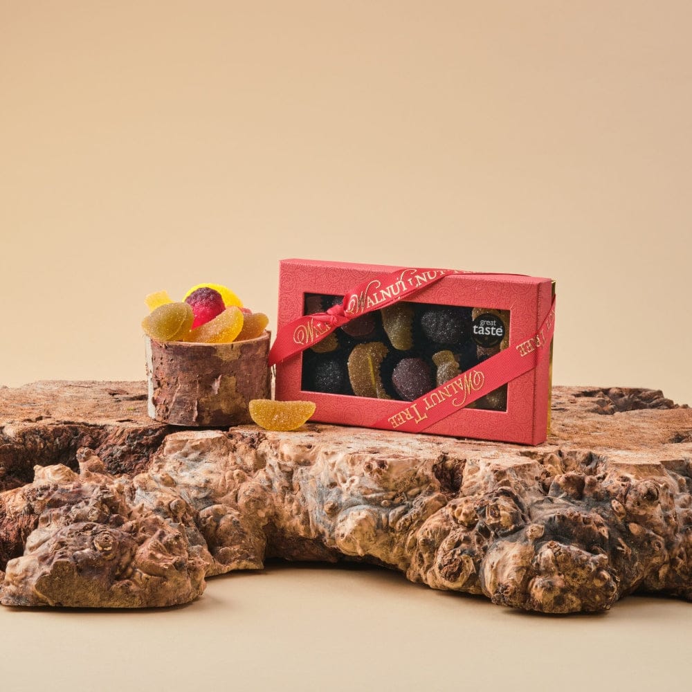 The product image shows jewel-bright raspberry, orange, blackcurrant, and lemon pâte de fruits, each sugar-dusted, arranged in a gold-lined gift box tied with Walnut Tree’s signature ribbon.