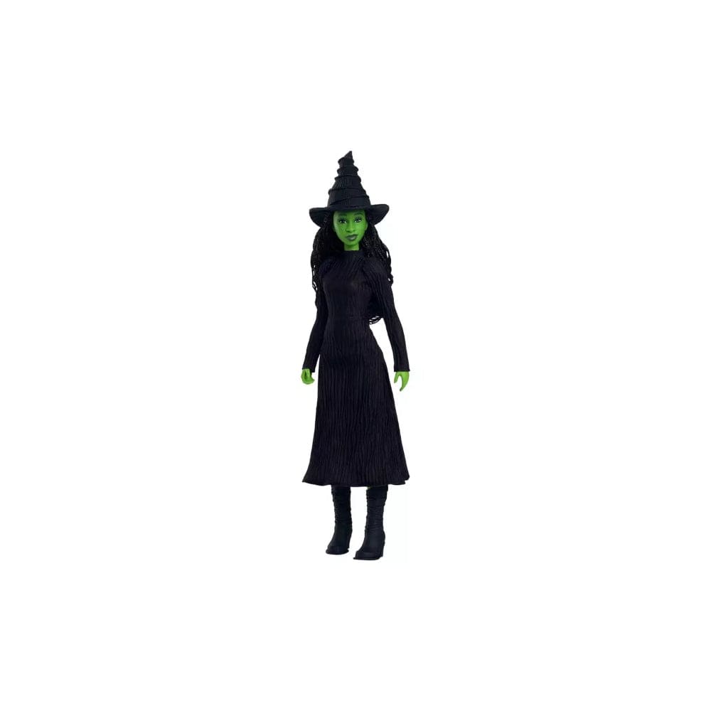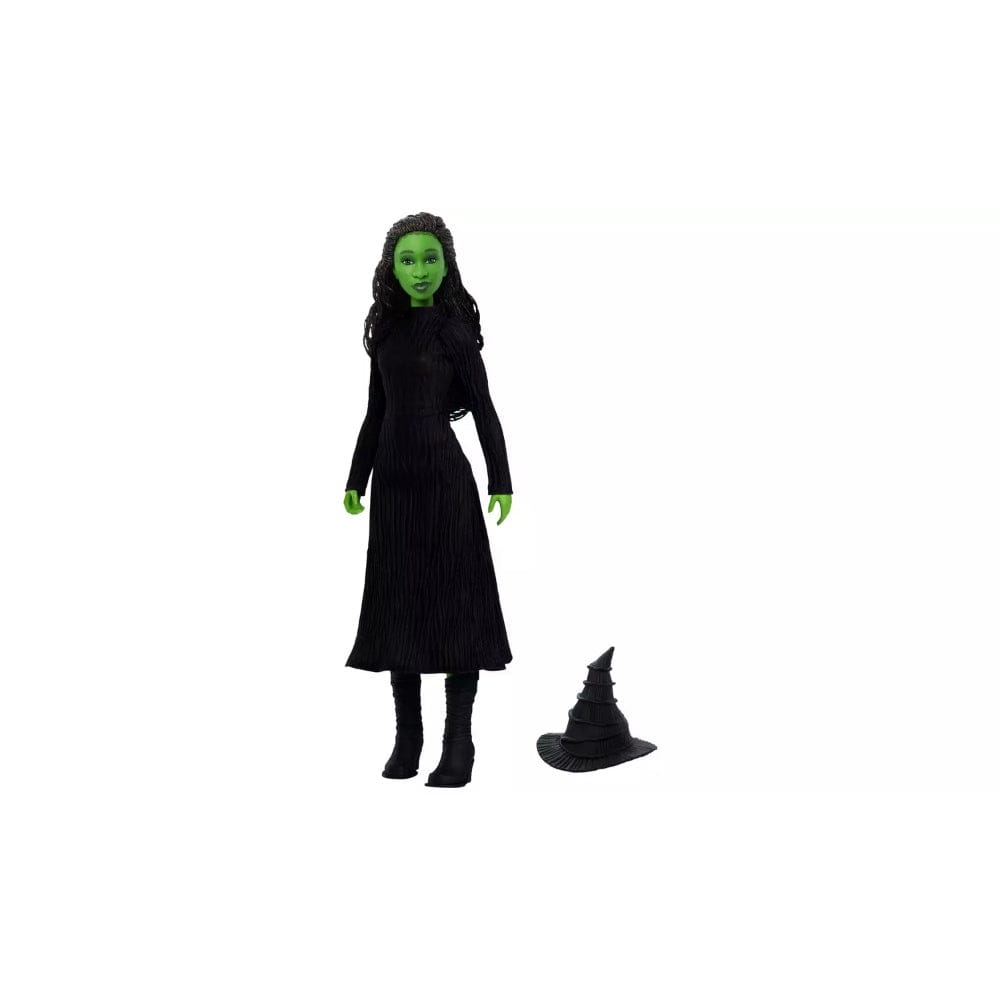 Elphaba fashion doll captures the heart of empowerment and defying the odds. Press the button to hear clips from her iconic song, Defying Gravity. The Shiz University student wears a removable, soft black gown accessorized with her signature pointed hat and chunky heeled shoes. Long, braided hair and her green skin complete the movie-inspired look. Elphaba doll makes a musical gift for fans of the musical, who will want to sing along. Dolls cannot stand alone.
